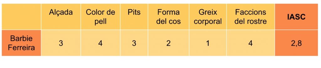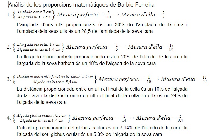 Aquest resultat demostra que físicament, Barbie Ferreira no s’allunya molt a la xifra de proporció àuria, encara que es sobrepassa del número. El seu cos no segueix matemàticament una harmonia i una perfecció respecte a la bellesa matemàticament establerta.