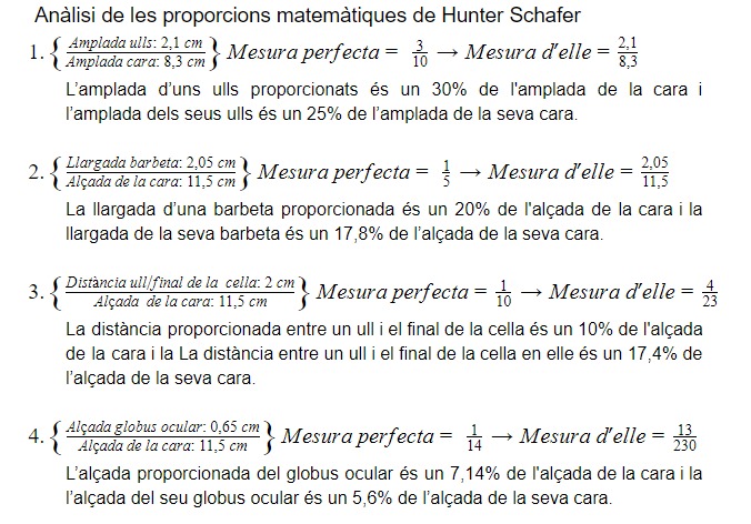 Exceptuant el setè criteri de les proporcions, la resta no es diferencien més d’un poc percentatge de la proporció harmònica. La proporció de Hunter Schafer és lleugerament propera a la proporció àuria perfecta del cos, però allunyant-se del nombre àuri més que els influencers normatius.
