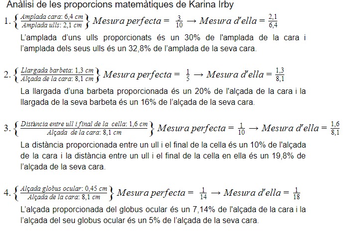 Aquest resultat demostra que físicament, Karina Irby s’apropa bastant a la xifra de la proporció àuria. Això dicta que el seu cos segueix matemàticament una harmonia i una perfecció respecte a la bellesa matemàticament establerta.