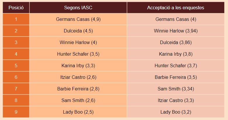 L’ordre dels influencers segons l’IASC i l’ordre segons l’acceptació que mostren els resultats de les nostres enquestes coincideixen bastant bé. Tot i que el marge de puntuació no coincideix, essent de 4,9 a 2,5 en l’IASC i de 4 a 3,2 a les valoracions populars, si coincideix l’ordre. De manera que podríem afirmar que l’IASC és un bon reflex de la societat pel que fa a la relació que hi ha entre els subjectes valorats.