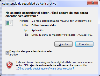 Un cop que ja tenim el programari ara cal instal·lar-lo. Fem doble clic a sobre del fitxer lame 3.99.3.exe i ens surt l’advertiment de seguretat corresponent. Cliquem a Ejecutar.