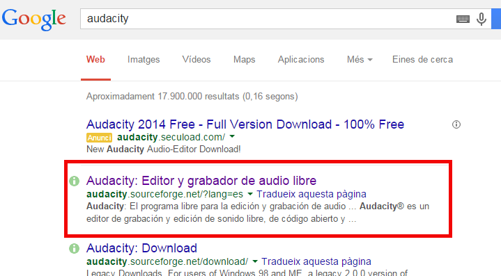 Primer de tot, cerquem, al nostre navegador, el programa Audacitiy.