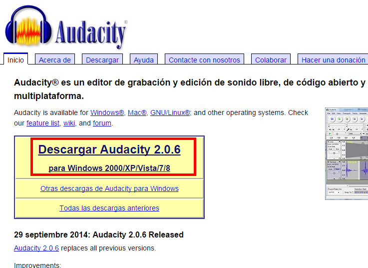 Cliquem al segon enllaç i anirem a la plana on podrem descarregar l’aplicació, clicant a l’enllaç Descargar Audacity 2.0.6.