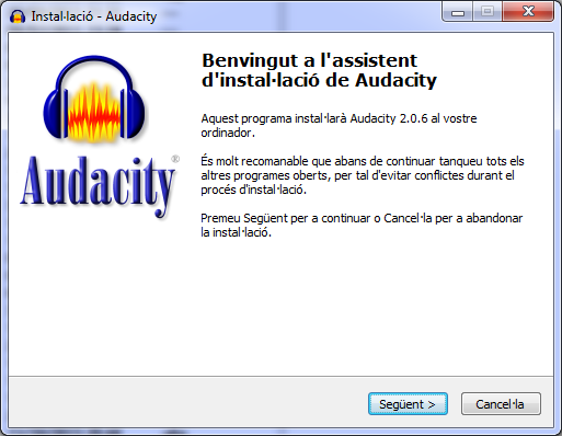 S’obre l’Assistent d’instal·lació d’Audacity. Cliquem a Següent.