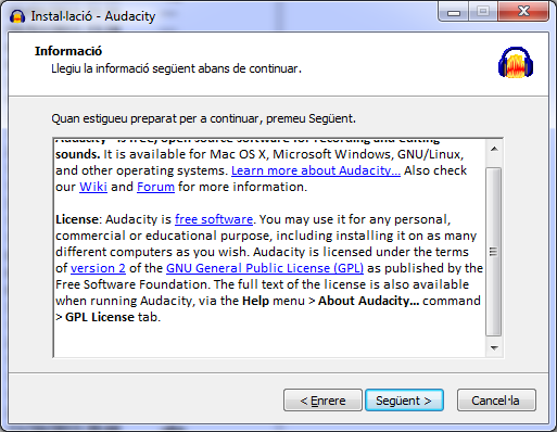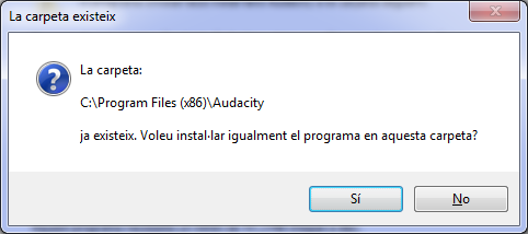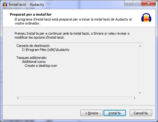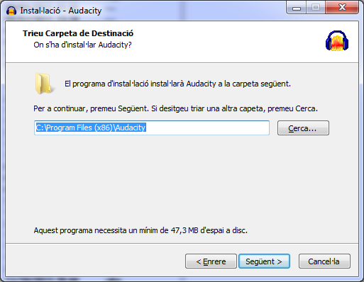 Informem de la ruta on volem que s’instal·li Audacity. Cliquem a Següent.![]()