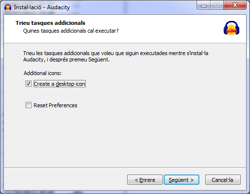 Ens informa de les possibles tasques addicionals que pot fer l’instal·lador. Per defecte, ve activada l’opció de crear una icona a l’escriptori. Cliquem a Següent.