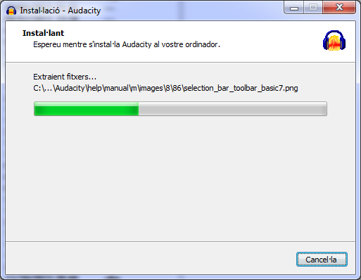 A la finestra següent, esperem uns segons i s’obrirà una altra finestra sobreposada que ens demana on desar el fitxer executable de l’Audacity. Informem de la ruta on volem desar el fitxer i cliquem a Guardar.