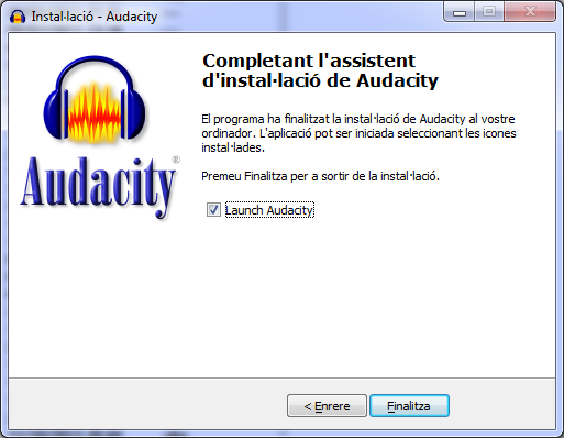 Ens informa que la instal·lació ha finalitzat. Si deixem activat Launch Audacity, quan cliquem a Finalitza s’obrirà l’aplicació.