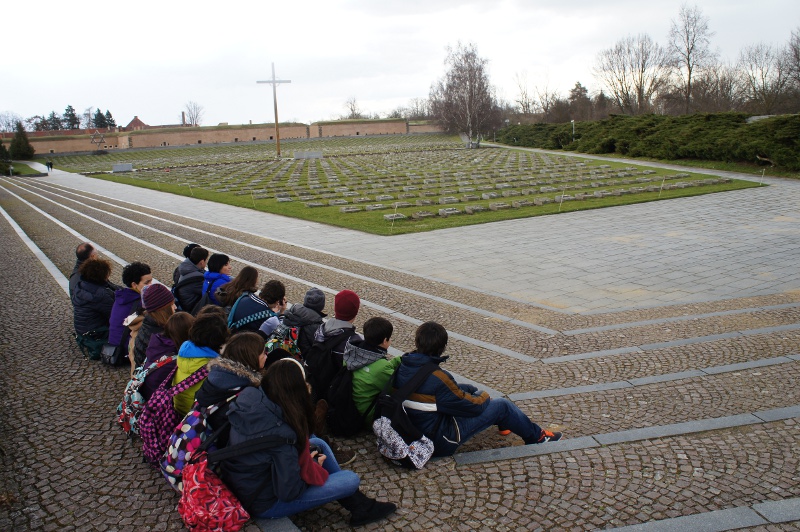 En arribar a Terezín, hem visitat el gueto, la petita gran fortalesa, de la mà d’una guia: ens ha impactat a tots! Ens marcarà de per vida. Els dormitoris dels nois presoners, les cel·les de càstig, les dutxes, la taula on algun nen havia dibuixat l’escaquer per jugar a escacs… Les tombes amb les petites pedres al damunt per cadascuna de les visites que ha rebut, el silenci…