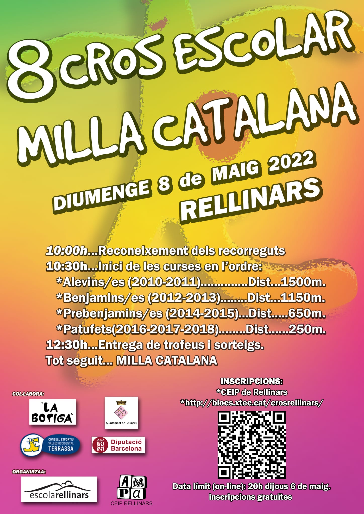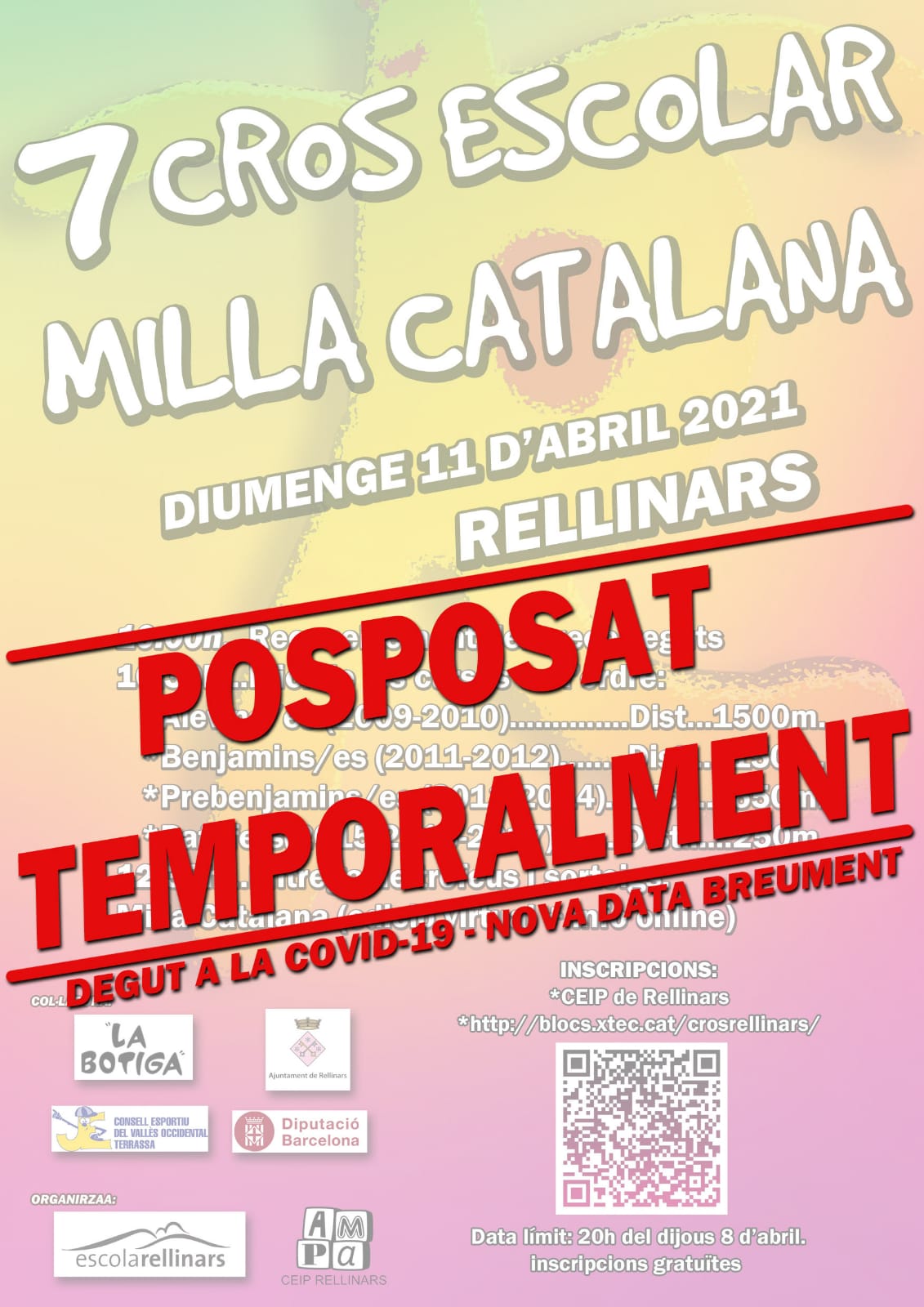 aquest cop, però, volem que sigui un CROS de petit format, pel que fa a les categories “dels més petits i joves” i per tant tant sols ACCEPTAREM INSCRIPCIONS dels alumnes de l’escola de Rellinars. De totes maneres, si les mesures sanitàries canvien… ja us ho faríem saber