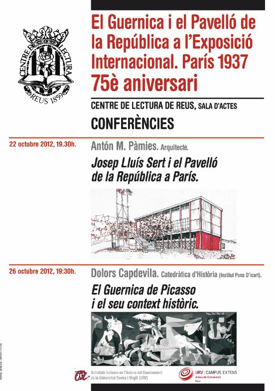 El Centre de Lectura ha programat unes xerrades amb motiu del 75è aniversari per una banda del pavelló de l’Exposició Internacional de Paris de 1937 i per l’altra del Guernica. La primera anirà a càrrec de l’arquitecte Anton Pàmies el dia 22 d’octubre i la segona, el dia 26, a càrrec de Dolors Capdevila Ollé, catedràtica d’història a l’Institut Pons d’Icart. Ambdues són d’interès pel món educatiu per l’enfocament pedagògic i didàctic que s’ha donat al contingut.