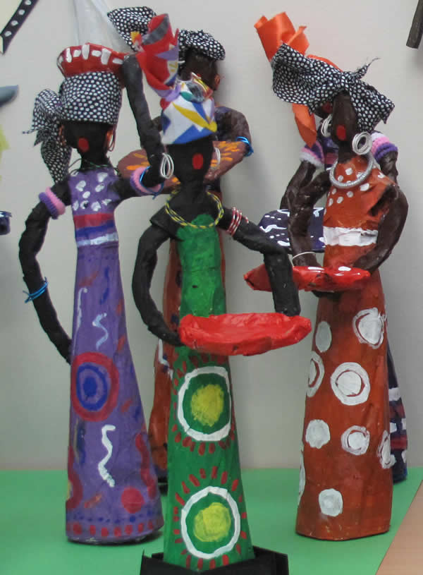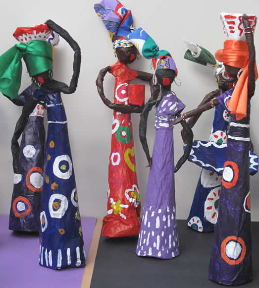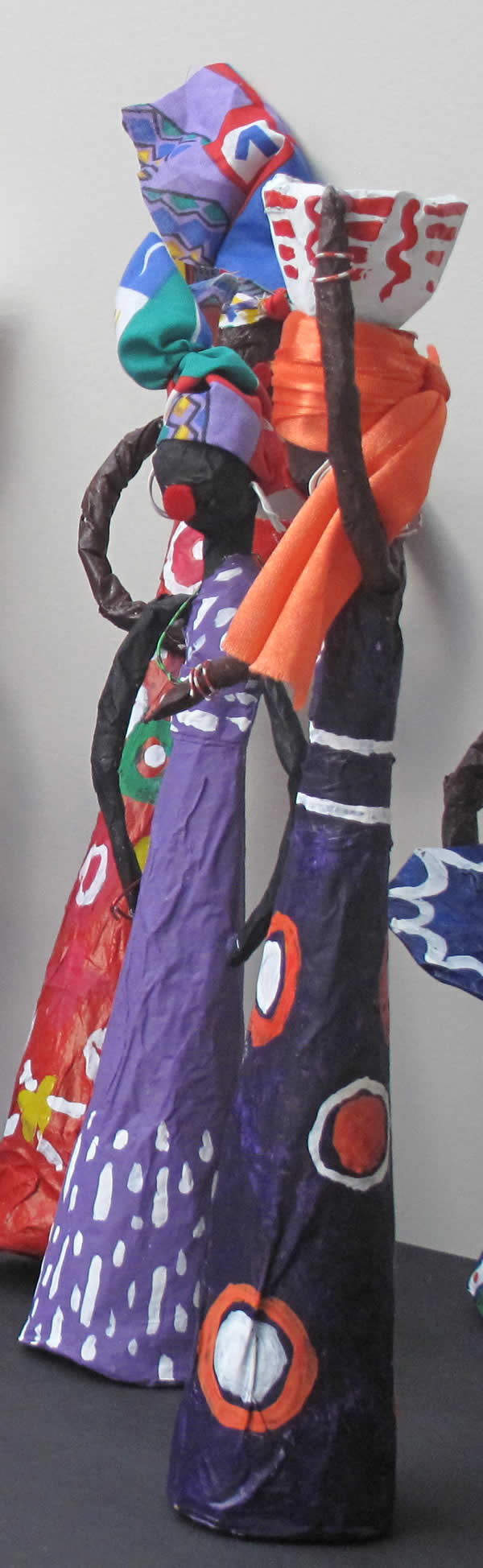 They are made of paper and glue and decorated with tempera and a fabric headdress. Do you like our clothing designs? They are unique.