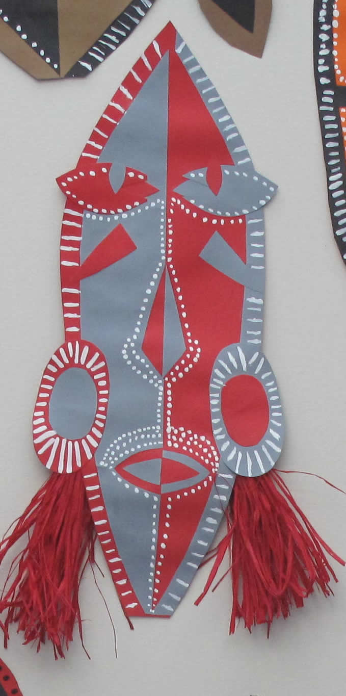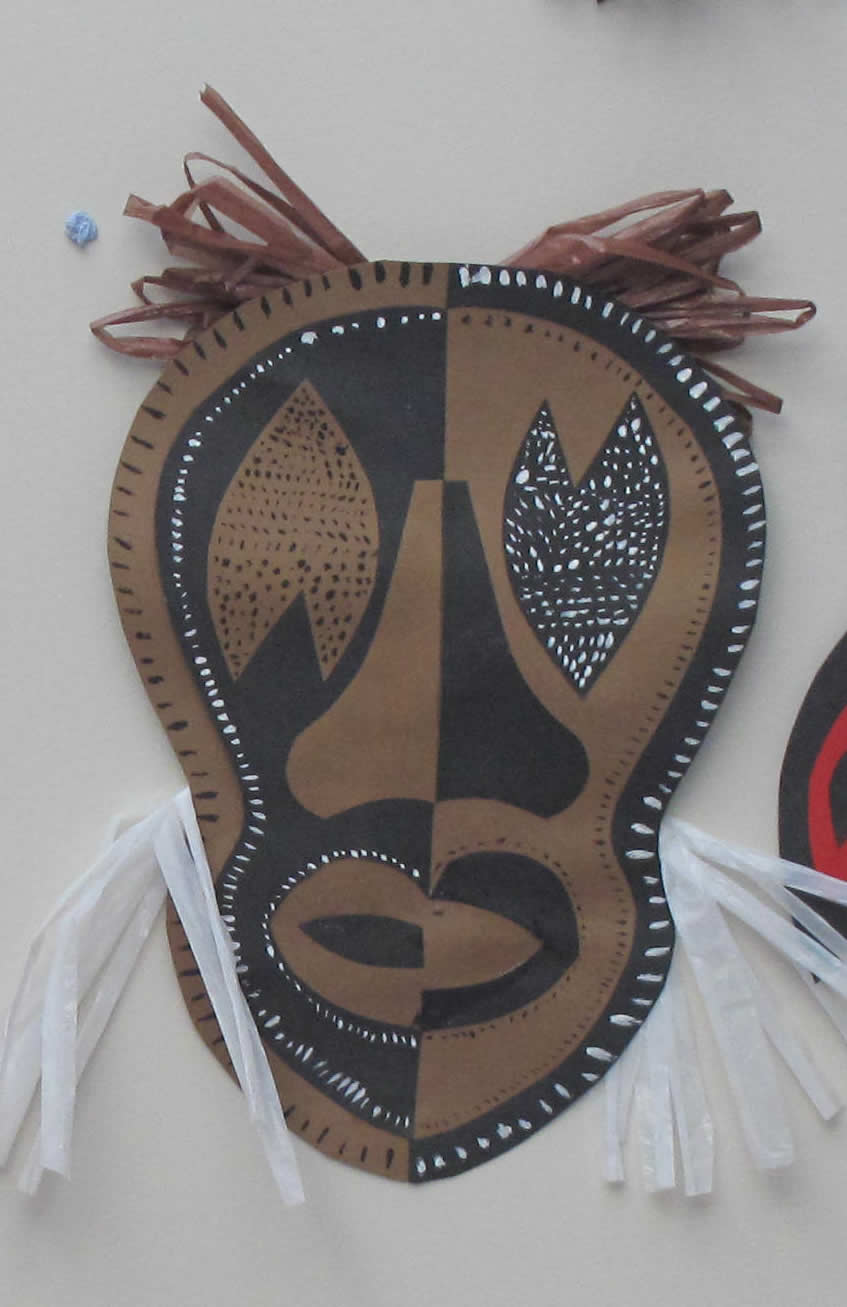 Our masks are made of cardboard and decorated with raffia and tempera. The point is they have a symmetrical shape.