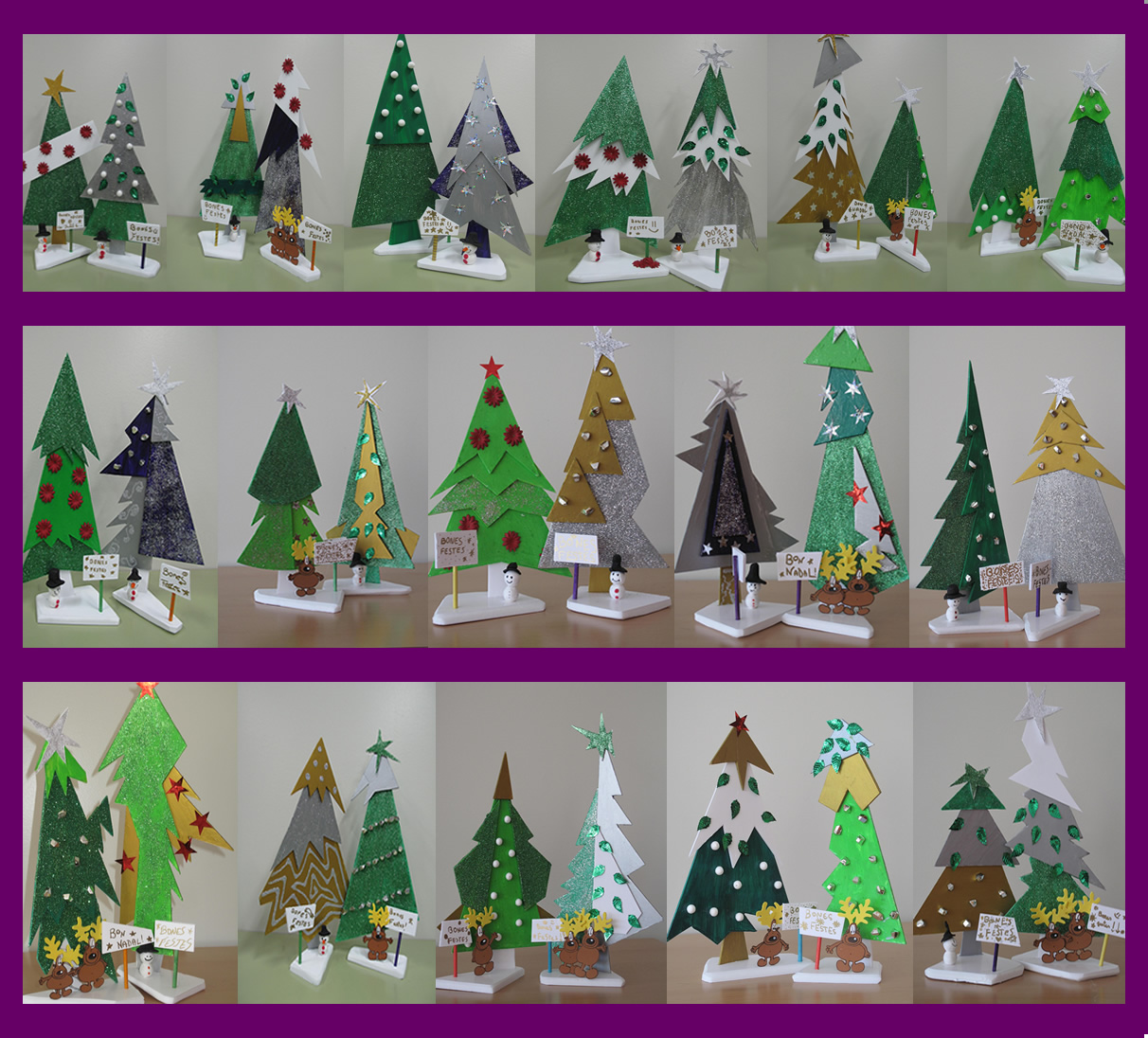 Doncs no. Són trenca-dos arbres diferents. Cada un dels nois i noies de sisè va elaborar un disseny propi i aquest n ‘és el resultat. El més important: valorar un treball creatiu, artesà i personal enfront dels milers d’ enlluernadors articles nadalencs que podem trobar a les botigues.