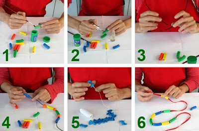 5. Utilitza el fil elàstic per fer els collarets amb els llaços de pasta. Passa el fil pel forat que tenen els llaços per darrera.