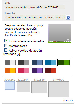 Per modificar les mides d’un vídeo inserit al vostre bloc podeu modificar els valors de les etiquetes width i height (les dues vegades que apareixen al codi d’inserció -si heu fet aquesta des de la pestanya Codi–). Aquí teniu una llista de mides que mantenen la proporció: