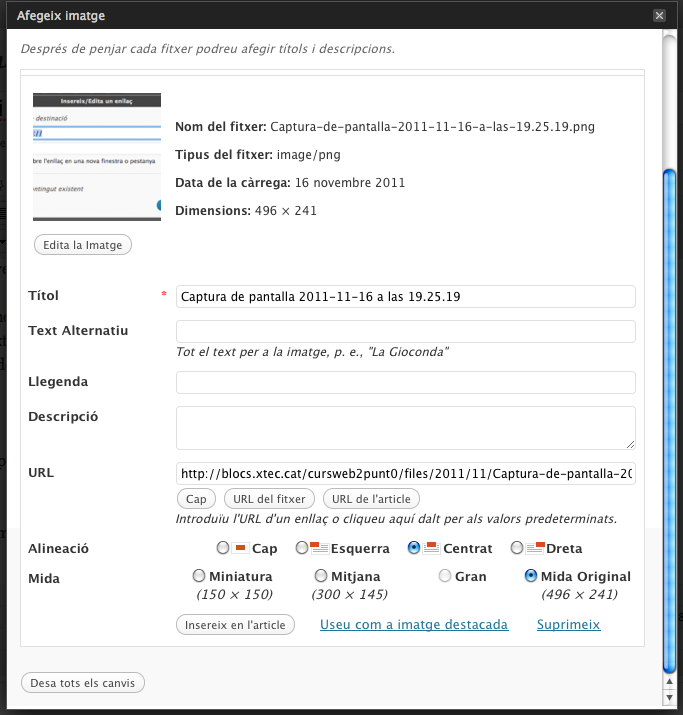 A dins de la finestra que s’obre en pujar o mostrar la imatge teniu a la vostra disposició la configuració d’algunes opcions referents a aquesta, com poden ser la seva alineació, mida o un enllaçar-la cap a alguna pàgina externa.
