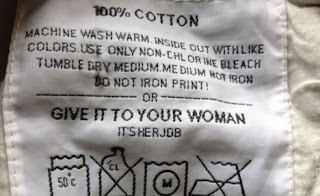 Desgraciadamente, todavía andamos muy lejos de ello. No sé si vosotros, lectores, habréis reparado en la imagen que ilustra esta entrada. En ella, puede verse una etiqueta de lavado en la que, tras las pertinentes recomendaciones de mezcla de colores, planchado, etc., se indica en inglés la alternativa “O dáselo a tu mujer; es trabajo suyo”. No voy a incidir en lo repulsivo de la leyenda, ante la cual no es excusa un más que dudoso sentido del humor; sí quisiera hacer notar (aunque es sobradamente notorio) que la mujer trabajadora está en desventaja no solo en el mercado laboral; también en casa.