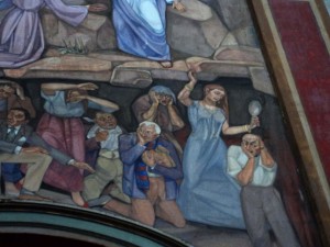 Els murals de l’església són impressionants. Es tracta d’escenes bíbliques i escenes de la vida de Sant Andreu apòstol i màrtir. S’inspira en la gent del barri. A la fotografia, feta per la Conxita Puigarnau, hi podem veure que un dels personatges porta una bufanda del Barça.