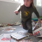 Avui hem fet una proposta que ha resultat molt interessant. Hem cobert tota l’aula de Psicomotricitat de papers de diaris i, quan ja estava ben coberta, hem començat a experimentar amb aquests papers.
