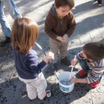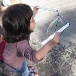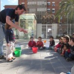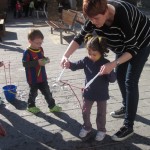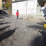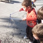 Una segona proposta va venir de mà del Sergi (pare de l’Aina) que ens va fer un taller de bombolles espectacular. L’ímpetu i l’emoció es va apropiar dels infants i dels adults que vam acabar tot mullats i plens de sabó i vam descobrir que hi havia infants amb un gran talent per a fer bombolles.