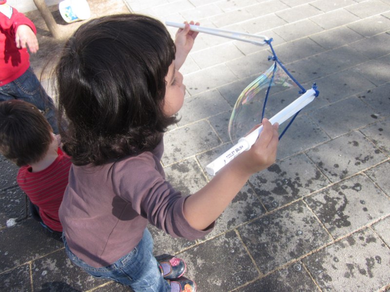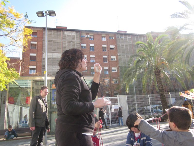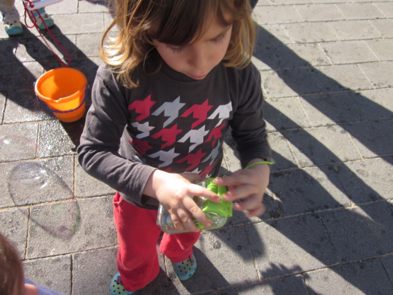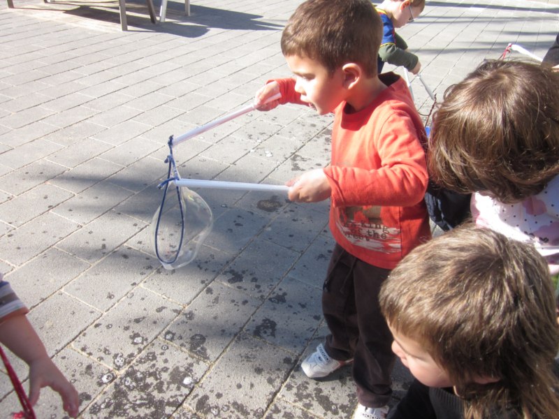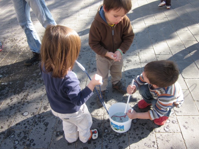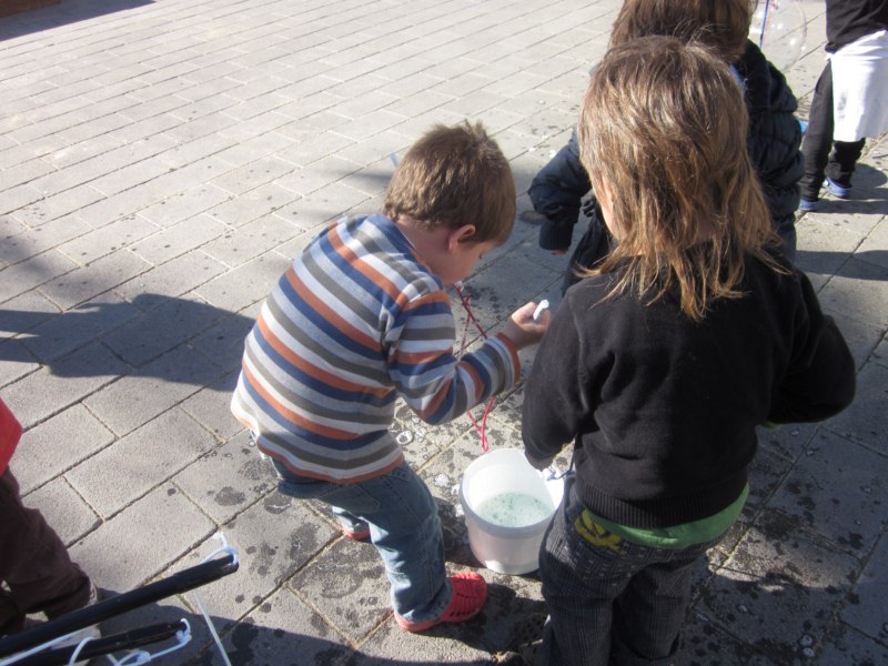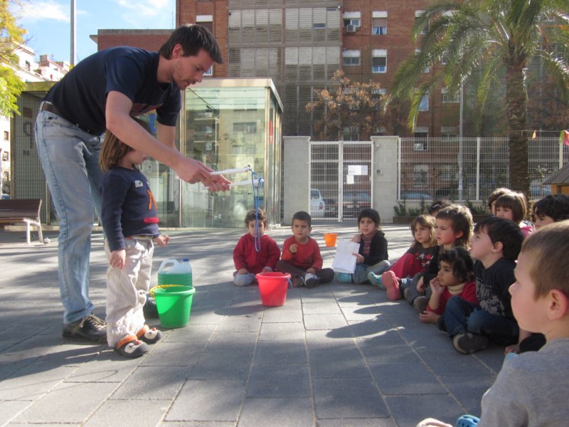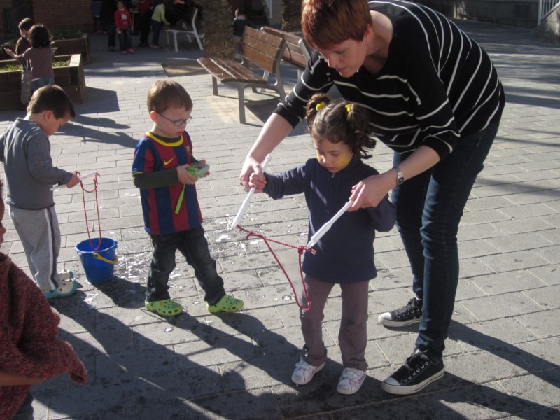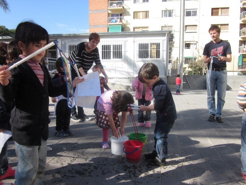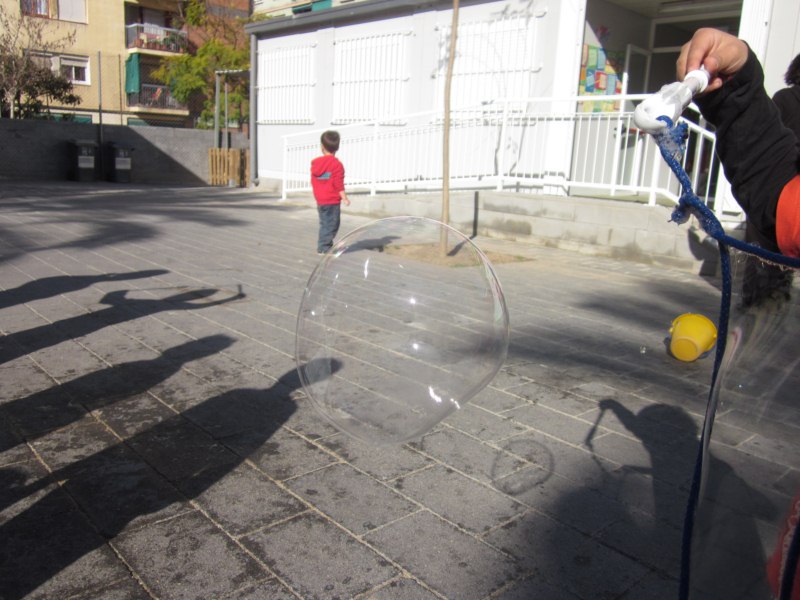 Una segona proposta va venir de mà del Sergi (pare de l’Aina) que ens va fer un taller de bombolles espectacular. L’ímpetu i l’emoció es va apropiar dels infants i dels adults que vam acabar tot mullats i plens de sabó i vam descobrir que hi havia infants amb un gran talent per a fer bombolles.