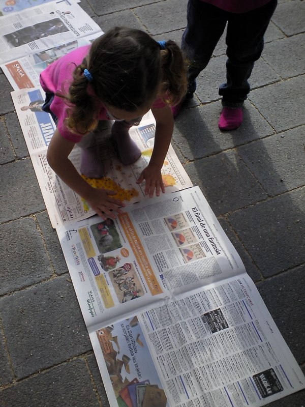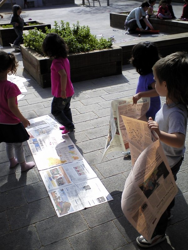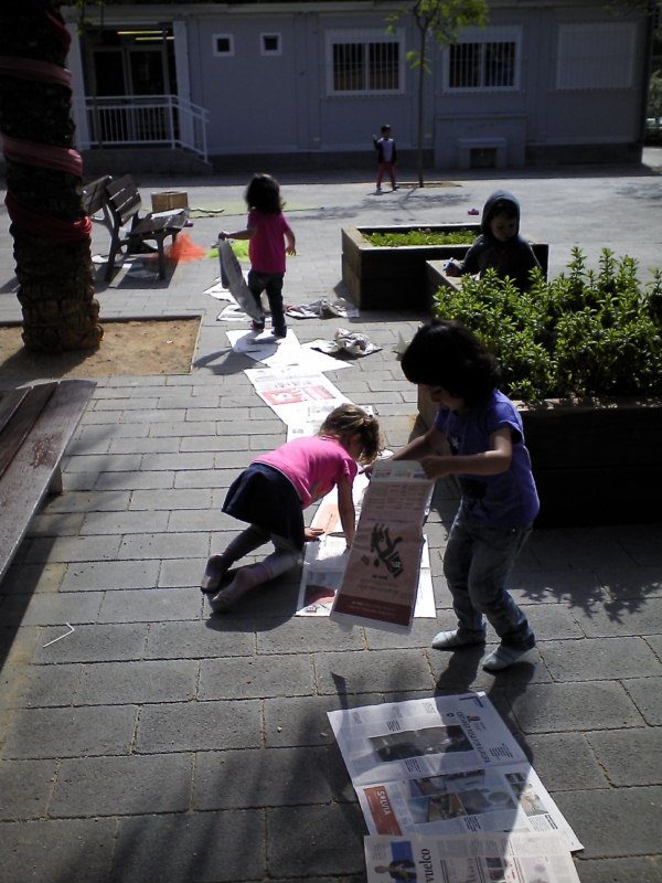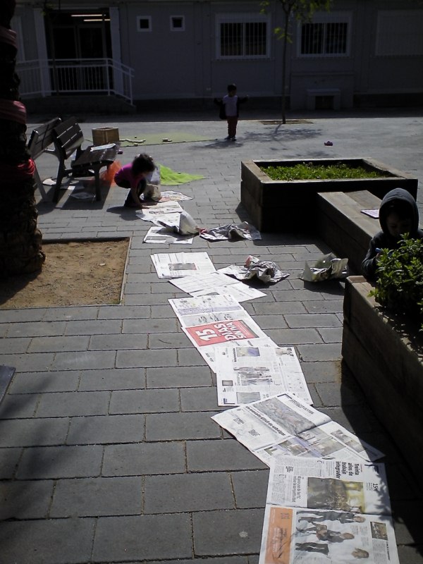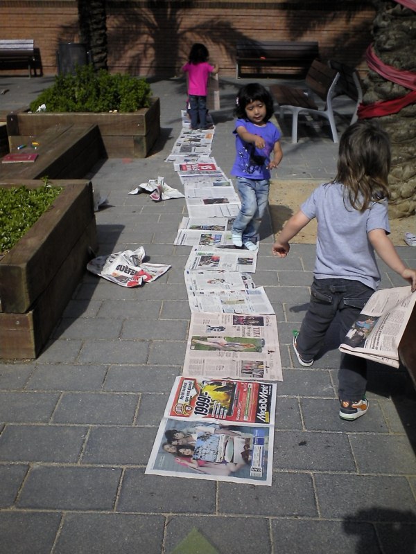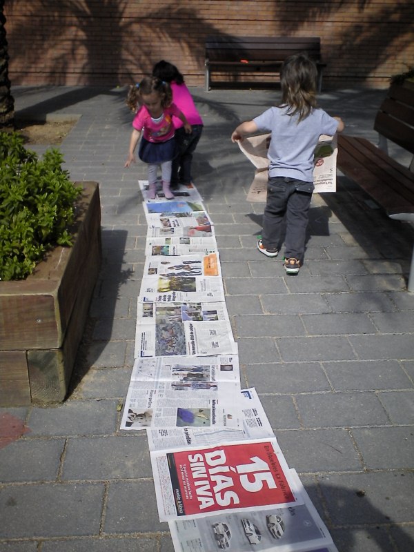Us volem presentar un dels reptes o desafiaments que, últimament, ens han impressionat més: fer el camí més llarg amb papers de diaris. L’altre dia un grup de nenes van tenir aquesta iniciativa i de forma molt sistematitzada anaven posant els papers. La qüestió consistia en recórrer tot el camí de papers de diaris fins arribar al final. Un cop arribaves al final, col·locaves un paper , el trepitjaves , sorties del camí i el recorries a l’inversa (però aquesta vegada fora del paper),tornaves a agafar un altre paper i tornaves a recórrer tot el camí novament, fins arribar al final i reproduir la seqüència que hem descrit.