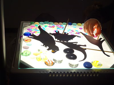 s, exploren els reflexes sobre els objectes, com amb un alot es pot fer més gran o més petita l’ombra d’un animal de joguina… a més que els permet focalitzar i estar concentrats, centrar l’atenció i transformar els objectes més quotidians en elements atractius, màgics quant es veuen sobre la taula de llum o el retroprojector.