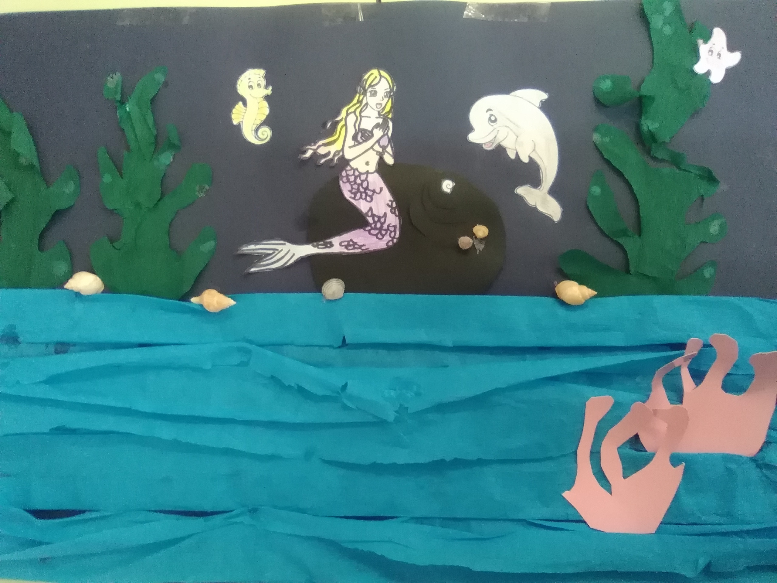 I have made a collage of the ocean and to do it I used blue cardboard, scissors,drawings, crayons, silk paper and also I used shells.