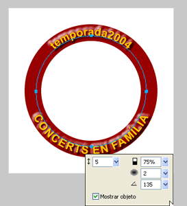 Escriviu el text temporada 2004. Utilitzeu la font Arial 20 negreta amb un color #FFCC00. Disposeu aquest text per sobre de l’arc. Seleccioneu els dos elements (text i arc). Després apliqueu l’operació Texto | Unir al trazado. Observeu com aquest s’ajusta a la forma de l’arc dibuixat prèviament.
