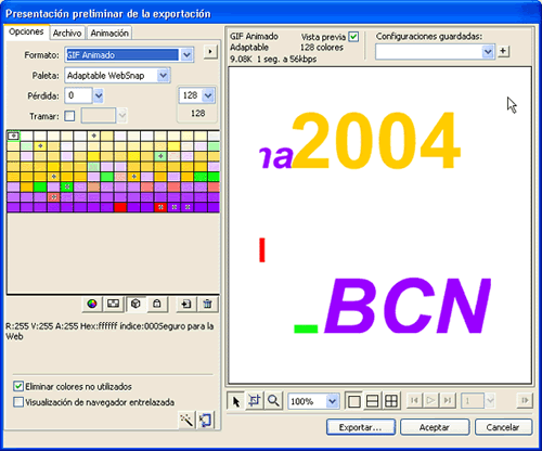 A mode d’apunt cal saber que les animacions fetes amb el Fireworks MX es poden desar com a GIF animats si obriu Archivo | Presentación preliminar de la exportación i seleccioneu un format GIF Animado