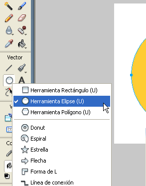 Comenceu com en l’exercici anterior: obriu un arxiu nou de 300×300 píxels amb el fons de color blanc. Dins d’aquest espai, dibuixeu-hi un cercle de 240 píxels de diàmetre, centrat i de color sòlid #FFCC33. Per a realitzar aquesta operació cal seleccionar Herramienta Elipse i mantenir premuda Majúscules. Fixeu-vos que l’Inspector de propiedades indica la grandària del cercle i la posició relativa respecte a les coordenades (x,y).