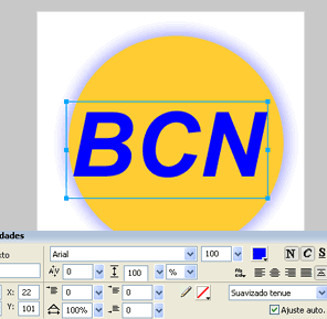 Sobre aquest rectangle escriviu en majúscules el text BCN amb les següents característiques: Arial, 105 de grandària, color #FFCC33, centrat horitzontalment i centrat verticalment respecte del rectangle que prèviament heu dibuixat. Recordeu que per a aquesta operació cal fer servir les ordres Modificar | Alinear | Centrar verticalmente i Modificar | Alinear | Centrar horizontalmente, i també que heu de tenir seleccionats alhora amb el Puntero tant el quadre de text com el rectangle