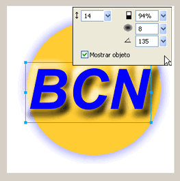Quan tingueu aquesta part de l’exercici acabada passeu a afegir un efecte aplicat al text BCN. En aquest cas utilitzeu Efectos | Bisel y relieve | Relieve elevado amb els següents paràmetres: contrast 94%, suavitzat 8, desplaçament 135, angle 135 i amplada 14.