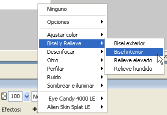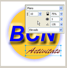 A continuació escriviu la paraula Activitats. La podeu situar a les coordenades x=115, y=204. Utilitzeu la tipografia Banff o una de similar amb una mida de 40, un color #990000, negreta i cursiva. Tot seguit, amb aquest text seleccionat, apliqueu Efectos | Bisel y relieve | Bisel interior.