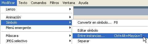 Fixeu-vos en la posició relativa de les instàncies que teniu damunt l’escenari. Seleccioneu-les ambdues i alineeu-les verticalment, tal i com ja heu fet en exercicis anteriors. Tot seguit podeu aplicar-hi l’animació. Per fer-la efectiva cal que seleccioneu les dues instàncies i després aneu a l’opció de menú Modificar | Símbolo | Entre instancias.