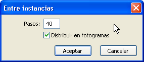 Us apareixerà ara el quadre de diàleg propi de l’opció Entre instancias. Indiqueu-hi el número de fotogrames que voleu, en aquest cas poseu 40, i seguidament activeu l’opció Distribuir en fotogramas. Accepteu aquest quadre de diàleg.