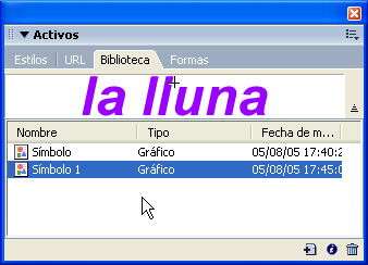 Seguiu animant un altre text repetint les operacions que us acabem d’explicar. Cal inserir el nom símbol al començament de l’animació, al Fotograma 1. Per això, feu visible Ventana | Fotogramas i feu clic a Fotograma 1. Obriu Editar | Insertar | Nuevo símbolo i, a Propiedades de símbolo, trieu l’opció Gráfico. Després escriviu la lluna amb la font Arial 50, color #9900FF i lletra cursiva.