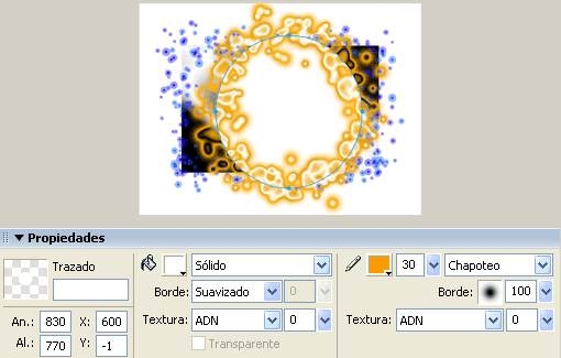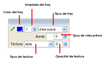 Ara, amb la línia seleccionada, apliqueu les primeres modificacions. Abans, però, indiqueu els valors de la transformació que voleu des de l’Inspector de Propiedades. Per exemple: Color del trazo: #0000FF, Anchura de trazo: 52; Borde: 40; Textura ADN: 80% i tipus de traç Lápiz | Pintada.