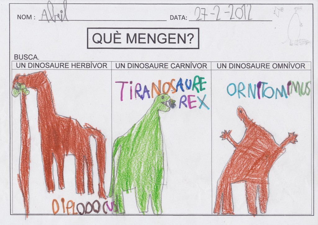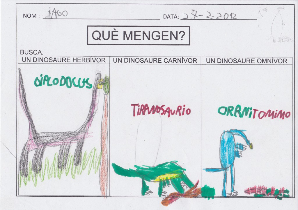 Un cop ja sabem que menjaven els dinosaures, ens proposem buscar dinsaures herbívors, carnívors i omnívors  els dibuixem.
