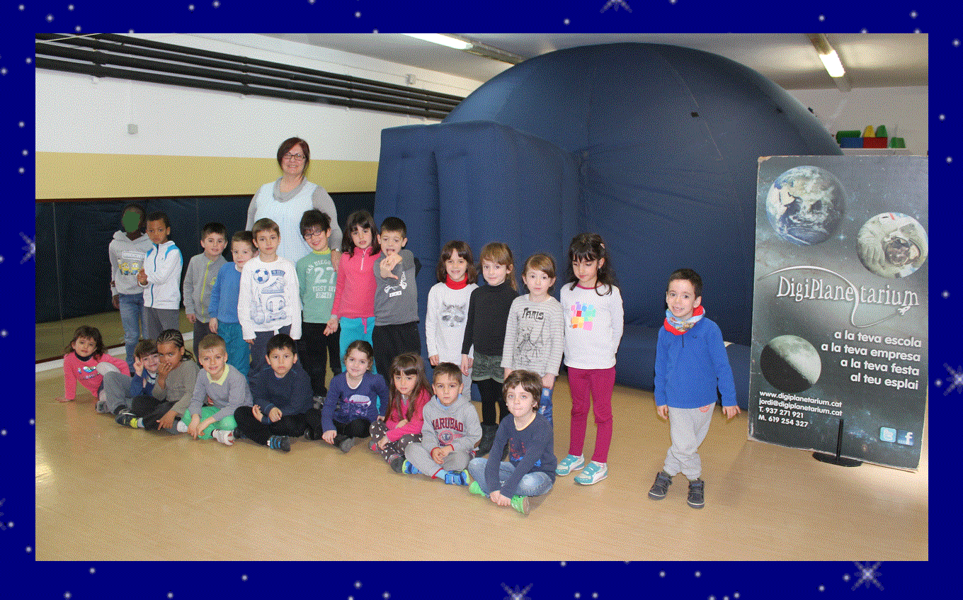 Primer de tot ens vam posar el casc i el vestit d’astronauta imaginari i vam entrar a la cúpula preparats per a iniciar el viatge per l’espai. Estàvem enmig d’un camp i es va començar a fer de nit, vam veure les fases de la lluna i les estrelles.