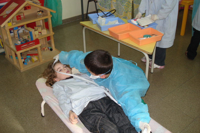 Com que estem fent aquest projecte hem muntat el racó de l’Hospital amb tota mena d’objectes que, tres mares que són infermeres, ens han portat perquè puguem jugar i aprendre amb material de veritat.