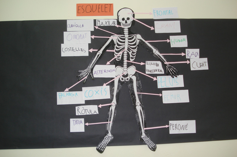 Per saber el nom del ossos hem demanat als nostres pares que ens en diguin uns quants a cadascú. Hem portat els noms a l’escola i entre tots hem fet el mural. Els noms que no sabiem els hem buscat an els llibres de la biblioteca de classe.