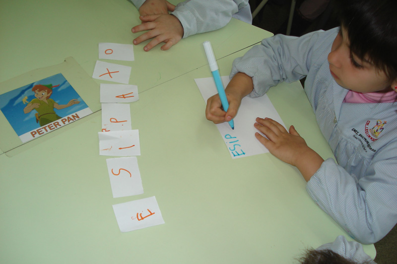 La mestra ens proposa el seguent: agafem una lletra del nom de cada animal dels que hem reunit els ossos. Despres cada taula posa les lletres triades en un paperet i, fent una combinació que es pugui llegir, creem una paraula que serà  el nom del noste esquelet. Posem-nos a treballar que això sembla molt divertit!!!