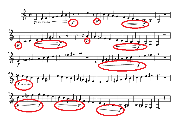 En una partitura els matisos d’intensitat del so es representen mitjançant una sèrie d’indicacions: