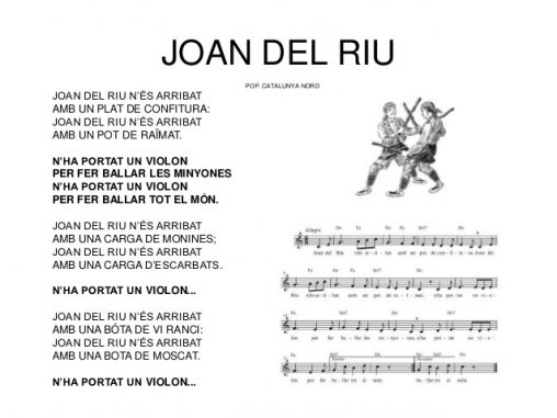 1. Joan del Riu n’és arribat amb un pot de confitura; Joan del Riu n’és arribat amb un pot de raïmat. N’ha portat un violon per fer ballar…