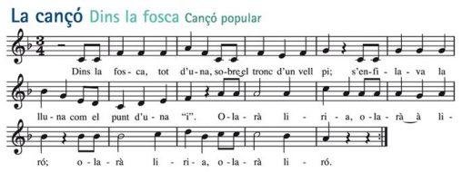 Dins la fosca, tot d’una, sobre el tronc d’un vell pi s’enfilava la lluna com el punt d’una “i”. Olarà liria, olarà liró! olarà liria, olarà liró!