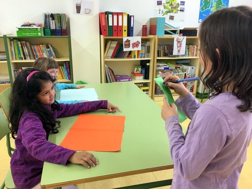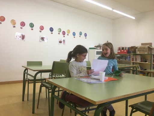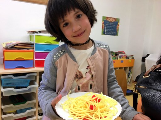 In the last session, the classroom has been decorated as if it were an Italian-style restaurant. First, the students perform, all together, an activity consisting of an introductory represention of different types of food using their own body. Then, and by means of various visual elements such as pictures, posters and objects related to restaurants (paper plates and cups, plastic food trays, food images, etc.) students act out a short adapted dialog in pairs, which is a fun and unusual scene that takes place inside the restaurant. The final proposal is to design a paper plate of spaghetti using yarn.