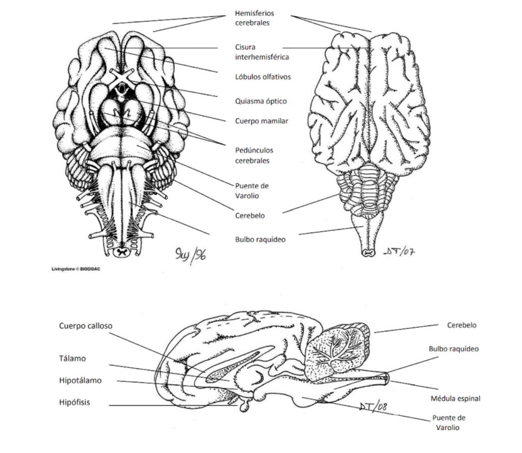 - Identificar de la cara ventral els lòbuls olfactoris, els nervis òptics i el bulb raquidi.