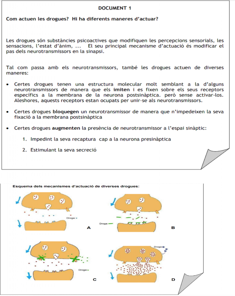 - Quin efecte té la droga estudiada en la sinapsi. Per dur a terme aquest apartat us deixem dos documents en els que s’expliquen els efectes que poden produir les drogues en la sinapsi i així, segons el que expliqui el testimoni, podem deduir si l’efecte de la droga consisteix a activar o a disminuir la comunicació entre les neurones i relacioneu-ho amb possibles mecanismes d’acció de la droga sobre la sinapsi. És en aquest apartat on podeu crear un Stop Motion o petit vídeo del procés.